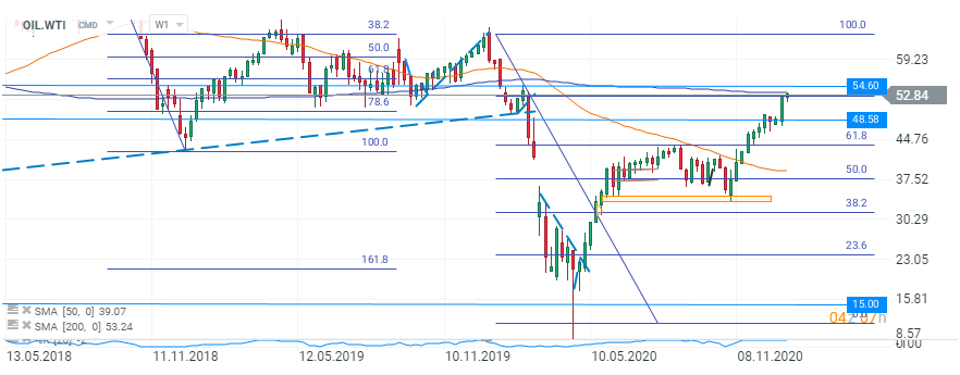 Există însă semne că prețurile ar putea începe să se ”supraîncălzească”. Petrolul WTI se tranzacționează acum în apropierea mediei mobile de 200 de săptămâni, ceea ce este un semnal că ar putea întâmpina un obstacol în viitorul apropiat. În plus, vedem că în această zonă se află și nivelul de 54,60 USD, care a marcat un vârf local din februarie 2020, care, în cazul în care ar fi depășit ar putea deschide drumul către niveluri mai ridicate. Maximul anului trecut de la 65,10 USD pare să fie prima rezistență evidentă, prin urmare există spațiu de manevră.
