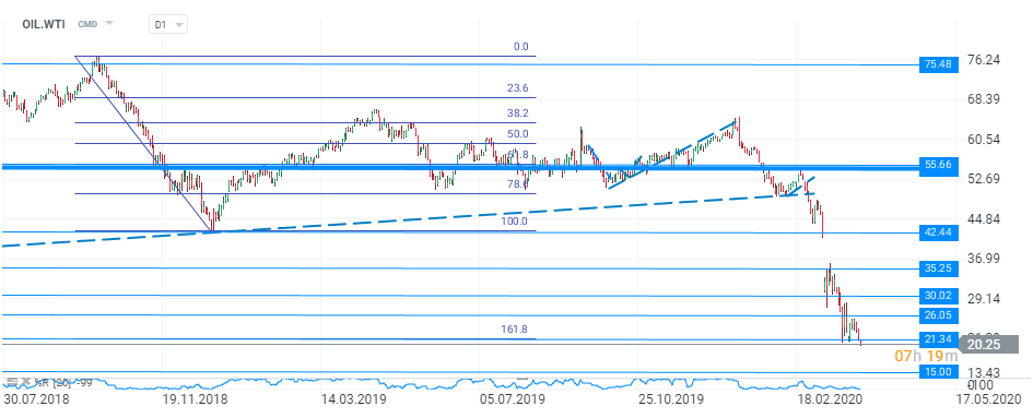 În acest context, cotația WTI nu se află într-un moment bun, pe graficul daily observăm că prețul pare să fii reușit să spargă nivelul de suport de la 21,30 dolari, care este susținut de o retragere exterioară Fibonacci de 161,8% din corecția descendentă din perioada octombrie - decembrie 2018. Nivelul părea să aibă o importanță crescută, oferind susținere cumpărătorilor în ultimele săptămâni negative. De această dată, spargerea ar putea fi confirmată, mai ales dacă vom asista la o închidere zilnică sub această barieră, scenariu ce ar putea afecta și mai mult încrederea cumpărătorilor. Având în vedere factorii actuali din piață, balanța pare mai degrabă înclinată descendent. Astfel, se așteaptă ca nivelul cererii din această săptămână să scadă cu 26 de milioane de barili pe zi.