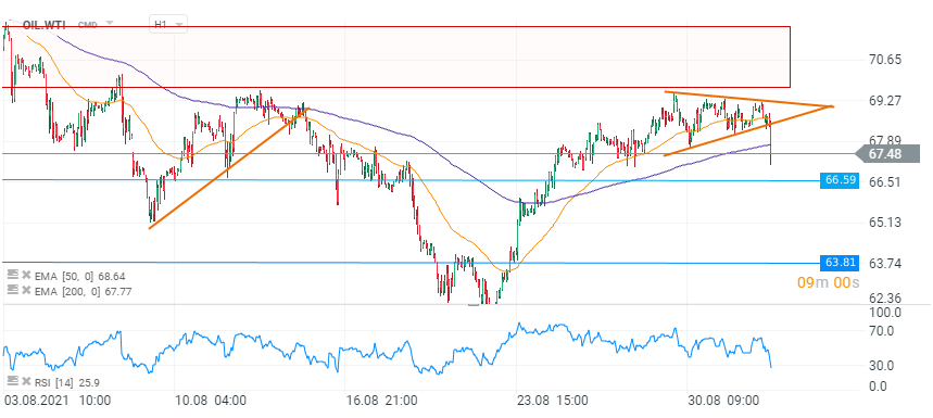 Din punct de vedere tehnic, cotația WTI a traversat o perioadă agitată. Deși materia primă s-a apreciat în prima jumătate a sesiunii, a pierdut în totalitate avansul și a suferit o inversare ca urmare a schimbării de atitudine înaintea evenimentului de astăzi. Astfel, această evoluție a dus la spargerea limitei inferioare a formațiunii de triunghi, care a determinat accelerarea secvenței descendente, vânzătorii așteptând un astfel de semnal bearish. De acolo, prețul a scăzut sub media mobilă de 200 de perioade (linia mov), dar traderii dau semne de indecizie după scăderea prețului sub acest prag tehnic, motiv pentru care am putea asista la o stabilizare a prețului, cel puțin înaintea deciziei OPEC+. Principalul nivel de suport rămâne la 66,60 USD, în timp ce o zonă cheie de rezistență se află la 69,80 USD (dreptunghiul roșu).
