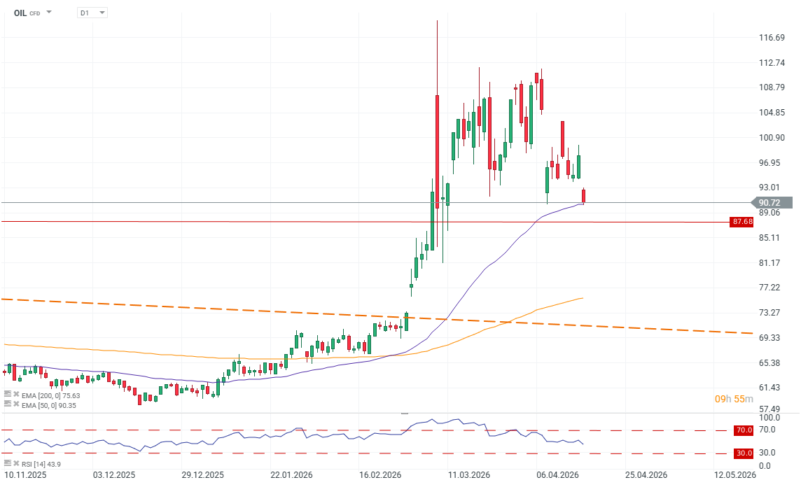 Ieri, petrolul s-a apropiat de 100 USD, întâmpinând o rezistență puternică la acest nivel. Astăzi, s-a retras sub EMA50 (dreapta mov), ceea ce ar putea indica un impuls descendent prelungit. Dacă negocierile ar reduce decalajul dintre Teheran și Washington, prețul ar putea suferi o presiune descendentă către 80 USD, unde observăm mai multe reacții semnificative ale prețului, și, în cele din urmă, către 70-75 USD, adică nivelurile de dinainte de război. Corecția de la maximele locale a depășit deja 20%. Dacă negocierile ar eșua și Iranul ar refuza să renunțe la programul său nuclear și la controlul asupra Strâmtorii Ormuz, țițeiul Brent ar putea reveni peste 100 de dolari pe baril.