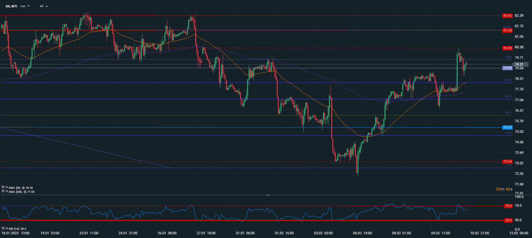 Din punct de vedere tehnic, petrolul a traversat o sesiune destul de agitată. După un debut al zilei lateral în apropierea mediei mobile de 50 de perioade (dreapta portocalie), cotația a avansat până la un maxim zilnic la 80,35 USD, valoare ce nu a mai fost atinsă din decembrie 2022. Ulterior, o parte din entuziasmul inițial s-a redus și pe fondul unei avalanșe de marcări de profituri ca urmare a creșterii impresionante. Niveluri de interes pentru moment sunt zona de suport de la 79 USD și rezistența de la 79,75 USD susținută de o retragere Fibonacci de 78,6% din impulsul descendent din ianuarie. Deși sentimentul este relativ optimist pe piața petrolului, rămâne o piață foarte sensibilă în fața fluxurilor de știri.