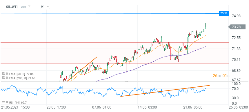 Acest context continuă să fie favorabil pentru cotația WTI, care își continuă mișcarea ascendentă și în această săptămână. Din punct de vedere tehnic, depășirea rezistenței locale de la 73,50 USD a oferit suficient entuziasm cumpărătorilor pentru a extinde mișcarea. Pentru moment, scenariul pare a se derula în favoarea petrolului: cotația evoluează deasupra celor două medii mobile, de 50 și 200 de perioade (liniile mov și portocalii), în timp ce indicatorul de sentiment RSI ne indică o linie ascendentă de trend care oferă direcție impulsului. Următorul obiectiv pentru tauri este zona 75,30 USD.
