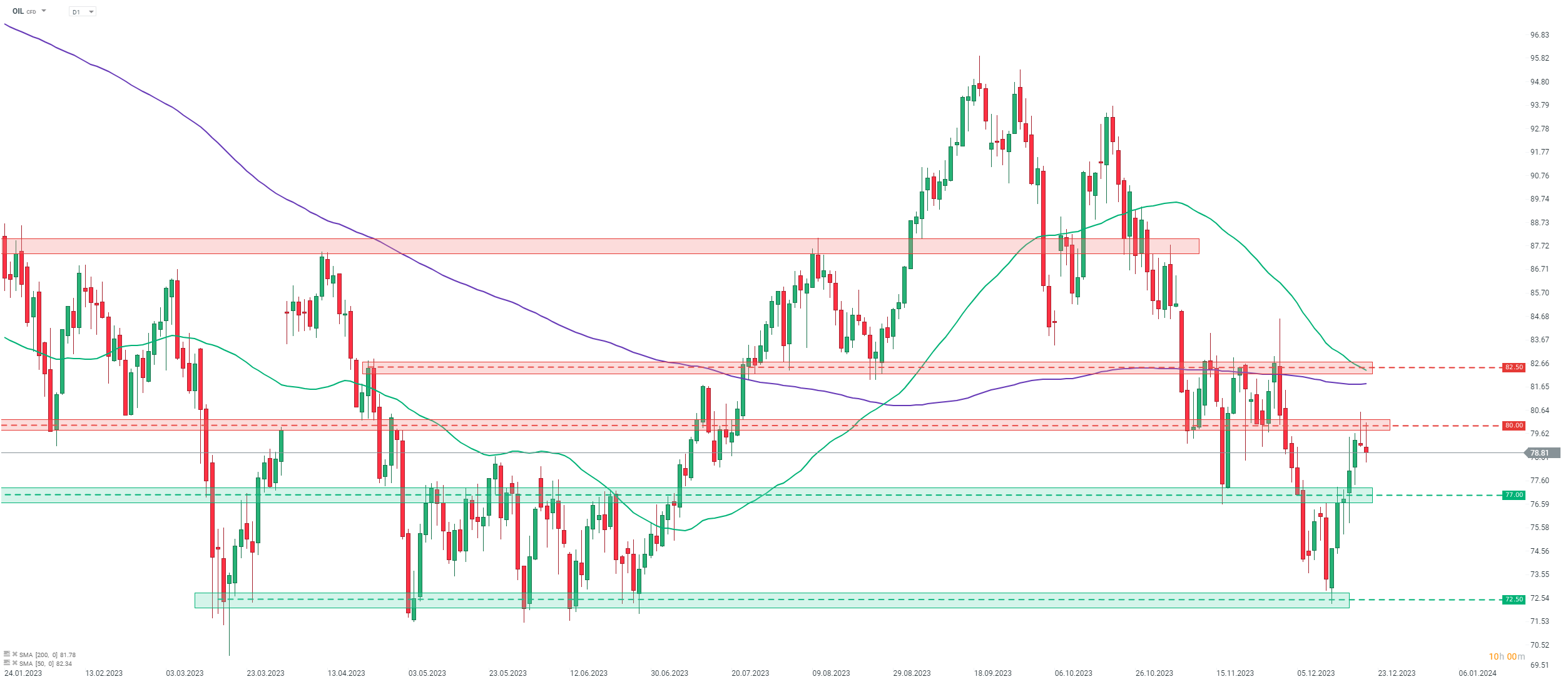 Prețul petrolului a avut o evoluție puternică în ultimele câteva sesiuni, sărind cu peste 10% de la minimele intraday atinse pe 13 decembrie 2023. Ieri s-a încercat depășirea zonei de 80 de dolari pe baril, dar taurii nu au reușit să păstreze aceste câștiguri, iar petrolul a încheiat ședința de tranzacționare de ieri sub acest nivel cheie. O altă încercare de a depăși zona de 80 de dolari a fost făcută în această dimineață, dar și aceasta a eșuat, iar retragerea a fost reluată. Scăderile au accelerat în prima parte a după-amiezii, când s-a raportat că Angola a decis să părăsească cartelul OPEC.