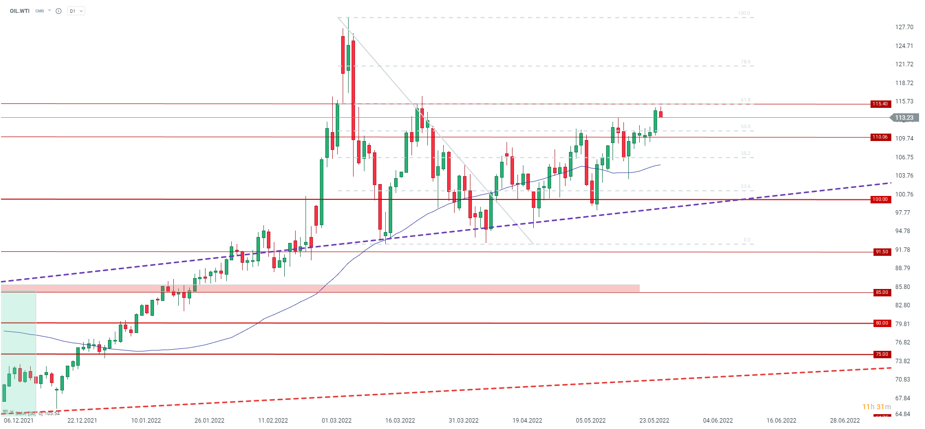 OIL.WTI inversează după rapoarte conform cărora procesul privind embargoul UE asupra petrolului rus va fi amânat. Sursa: xStation5