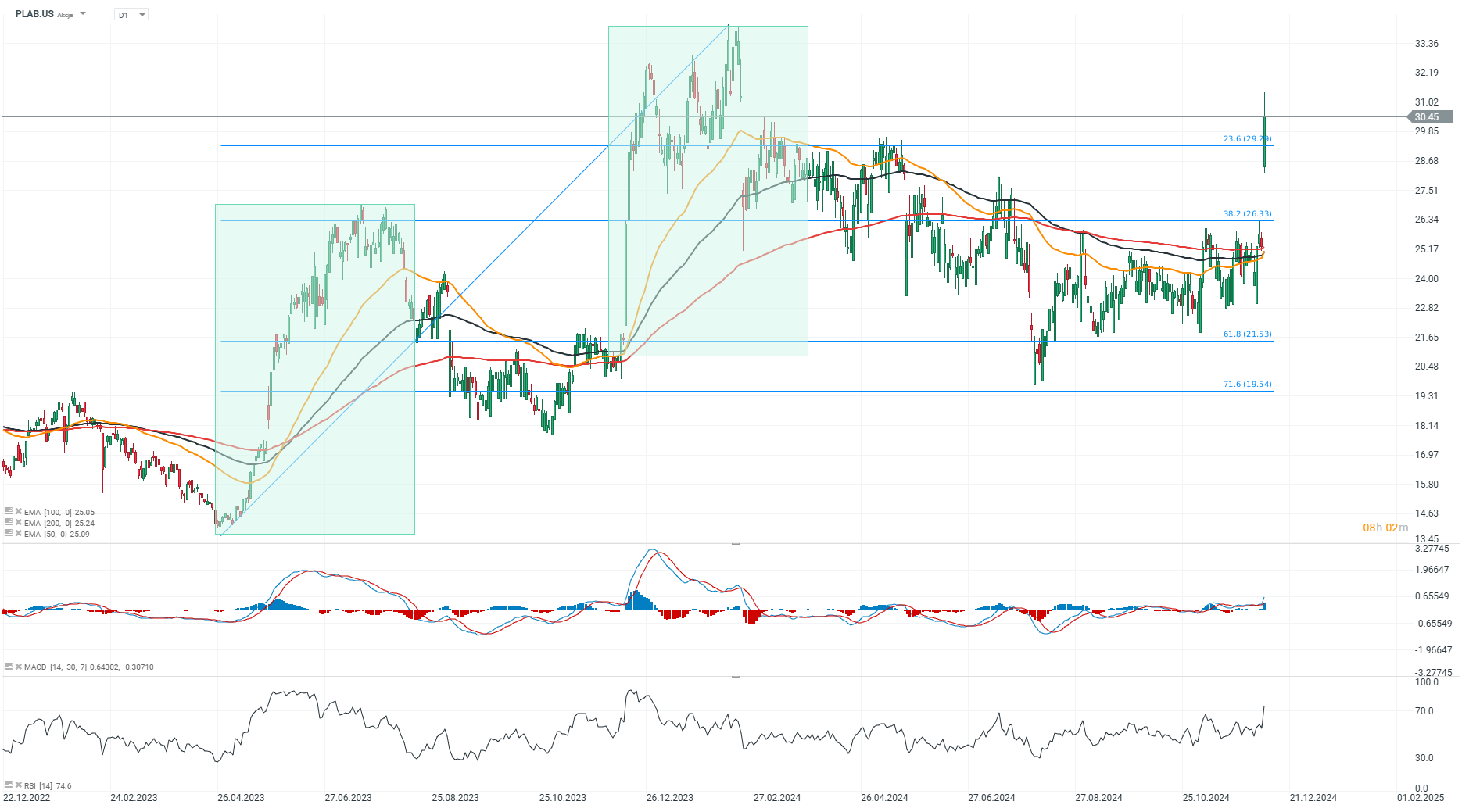 Numerarul și investițiile pe termen scurt ale Photronics (PLAB.US) la sfârșitul trimestrului au fost de 640,7 milioane de dolari, cu un cumul de datorii de 18,0 milioane de dolari. Pentru primul trimestru fiscal 2025, Photronics se așteaptă la venituri între 208 și 216 milioane de dolari, cu un venit net Non-GAAP atribuibil acționarilor între 0,43 și 0,49 dolari pe acțiune diluată. Astăzi, acțiunile companiei depășesc EMA200, EMA100 și EMA50 semnalând revenirea la trendul ascendent.
