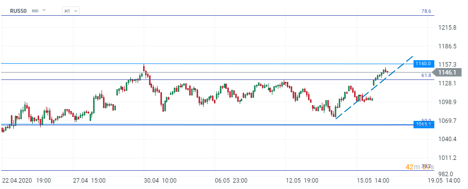 Din punct de vedere tehnic, indicele RUS 50 a reușit să depășească un punct cheie sub forma zonei de la 1130 de puncte, care este susținută de o retragere Fibonacci de 61,8% din impulsul corectiv din martie. Următorul nivel țintă de la 1160 pare a fi destul de îndepărtat în acest moment, traderii părând să fie deja destul de mulțumiți cu avansul marcat. În eventualitatea unei extinderi a mișcării corective actuale, care ar putea fi justificată de o posibilă marcare a profitului, primul nivel de susținere pentru cumpărători este linia ascendentă de trend, urmată de nivelul Fibonacci menționat anterior. Nivelul de la 1160 este unul interesant de urmărit în următoarea perioadă întrucât, deși a întrerupt mișcarea recentă de creștere, ar putea să fie depășit pe măsură ce activitatea economică se îndreaptă către capacitate normală. Mai mult, piața de capital din Rusia ar putea fi impulsionată și de decizia de rată a băncii centrale din iunie, unde se estimează o reducere a dobânzii, care în acest moment se află la 5,5%.