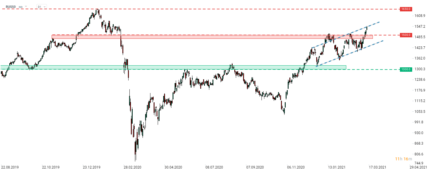RUS50 a depășit săptămâna trecută zona de rezistență de la 1.500 de puncte și s-a apropiat de limita superioară a canalului ascendent. Sursa: xStation5