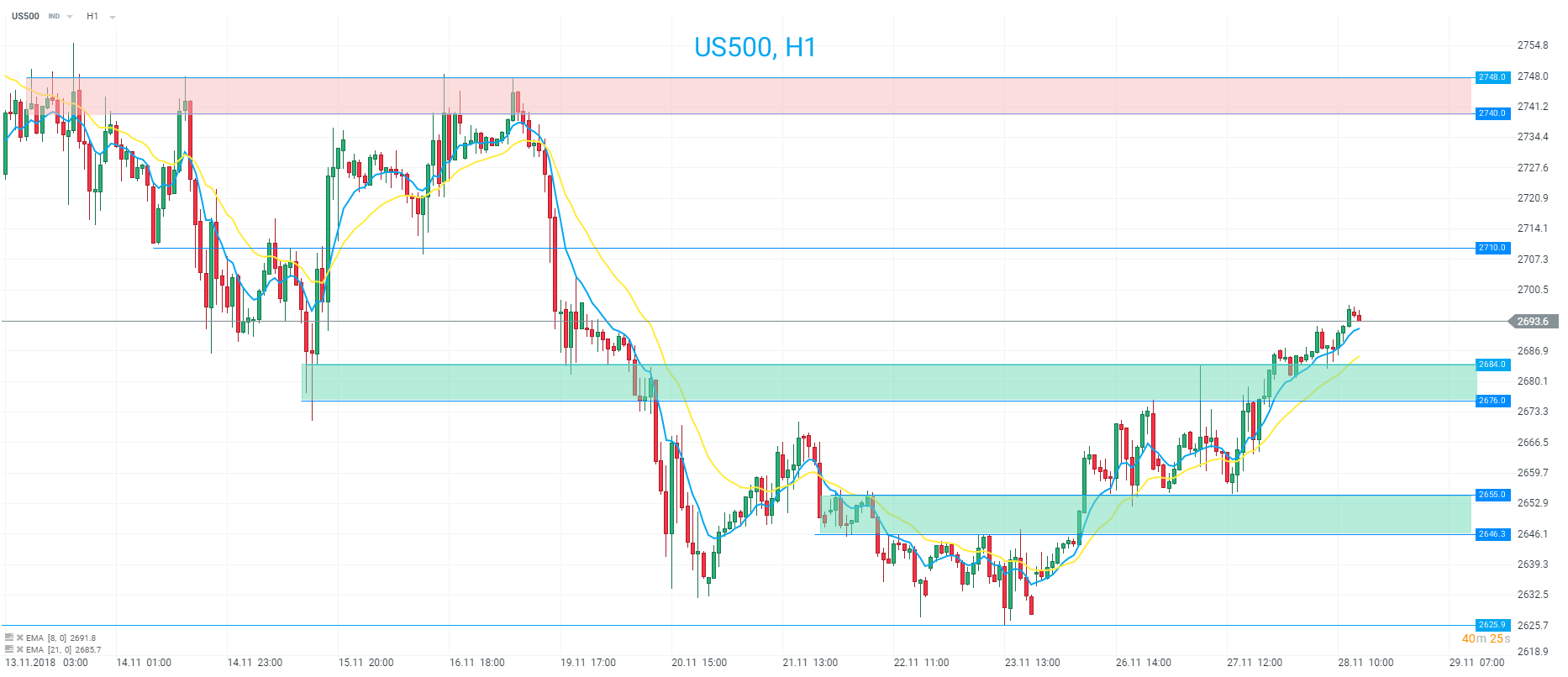 În timp ce US100 se pregătește de testarea unui potențial nivel de rezistență la începutul sesiunii americane, US500 pare să fi spart decisiv zona 2676 - 2684. În ultima săptămână, acest nivel a reprezentat un plafon pentru piață, dar spargerea în sus a schimbat perspectiva, care în acest moment pare mult mai optimistă. Nivelul 2710 și zona 2740 - 2748 ar putea reprezenta posibile ținte pentru cumpărători, iar fosta zonă de rezistență (2676 - 2684) ar putea acționa ca un suport.