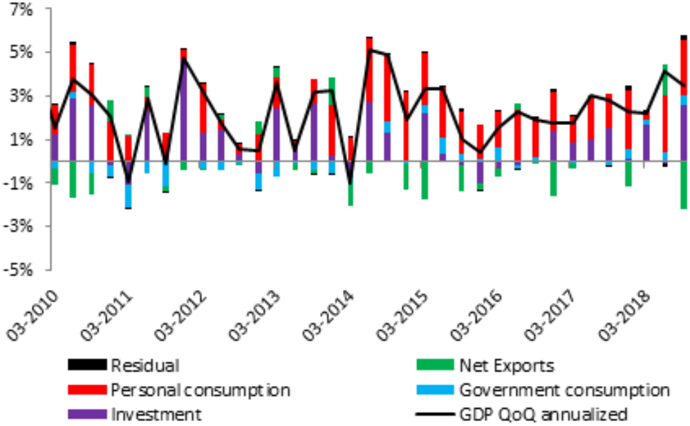Datele privind ritmul de creștere economic al SUA au adus o nouă performanță bună pentru Q3, rata de creștere de 3,5% fiind datorată preponderent consumului personal și investițiilor. Sursa: XTB Macrobond