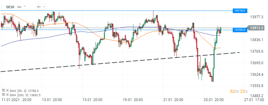 A doua sesiune a săptămânii a dus la o creștere a indicelui DAX de peste 1,1%, companiile de produse chimice și cele de servicii financiare reprezentând principalele motoare de astăzi. Astfel, cumpărătorii au reușit să profite de o îmbunătățire a atitudinii, reușind să ricoșeze după atingerea celui mai scăzut nivel de pe 5 ianuarie. Mișcarea ascendentă a fost foarte energică și a reușit să readucă rapid prețul deasupra liniei ascendente de trend, ceea ce reprezintă un eveniment încurajator pentru traderi. Entuziasmul pare să se fi temperat în momentul în care prețul ”s-a lovit” de rezistența de la 13.900 de puncte, care reprezintă un fost nivel de maxim. Testarea acestui prag pare să fi deschis drumul către o secvență de consolidare, investitorii dorind să afle noi informații înainte de a lua o decizie.