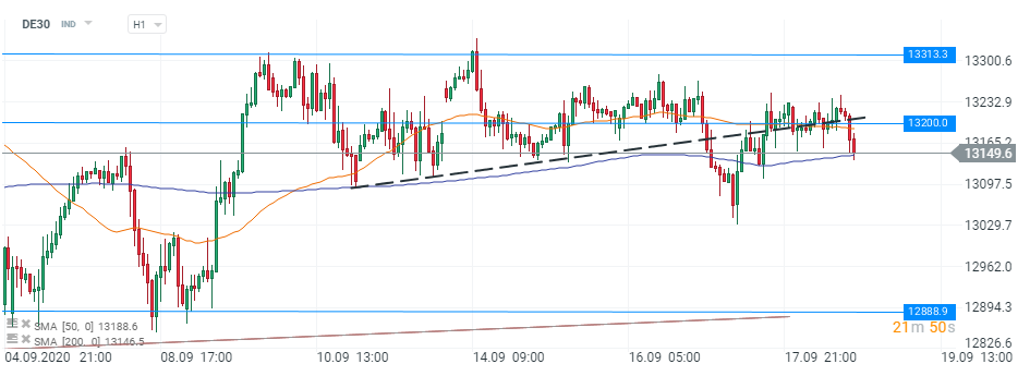 În ciuda acestui context, DE30 nu a reușit să marcheze o evoluție pozitivă, iar după un început de sesiune în care a oscilat în jurul nivelului de închidere de ieri, asistăm la o extindere a corecției. Spargerea zonei de la 13.200 de puncte reprezintă un eveniment important întrucât marchează un suport puternic fiind susținut și de linia ascendentă de trend pe termen scurt. O închidere săptămânală sub acest prag ar putea oferi mai mult curaj vânzătorilor la începutul săptămânii. Totuși, cumpărătorii par să mai aibă o șansă sub forma mediei mobile de 200 de perioade (linia albastră). O respingere ar putea duce la un început neutru de săptămână.