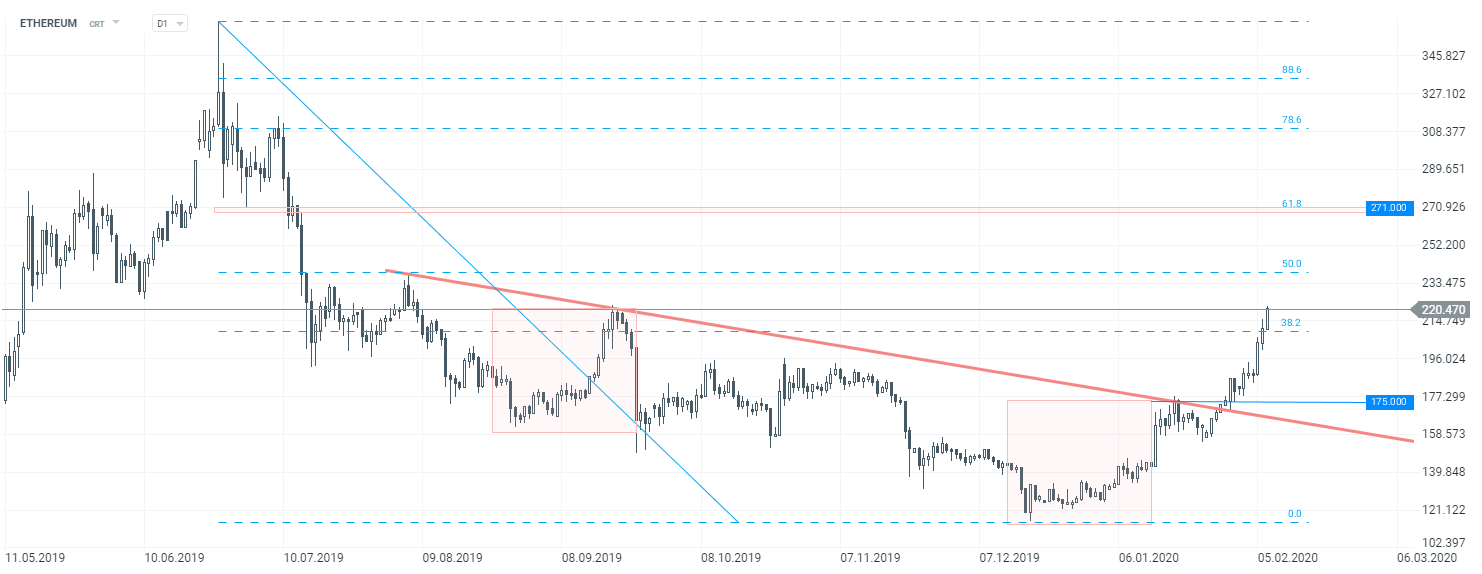 Situația tehnică a celei de-a doua mari monede virtuale arată, se pare, mai optimist. Mișcarea ascendentă a monedei Ethereum a accelerat în urma unei spargere a zonei de rezistență, la 175 dolari. Acest nivel a coincis cu limita superioară a structurii Overbalance și linia de trend descendent. În prezent, nivelul de 271 dolari ar trebui să acționeze drept cea mai apropiată rezistență cheie, întrucât este sprijinit de nivelul Fibo de 61,8%.