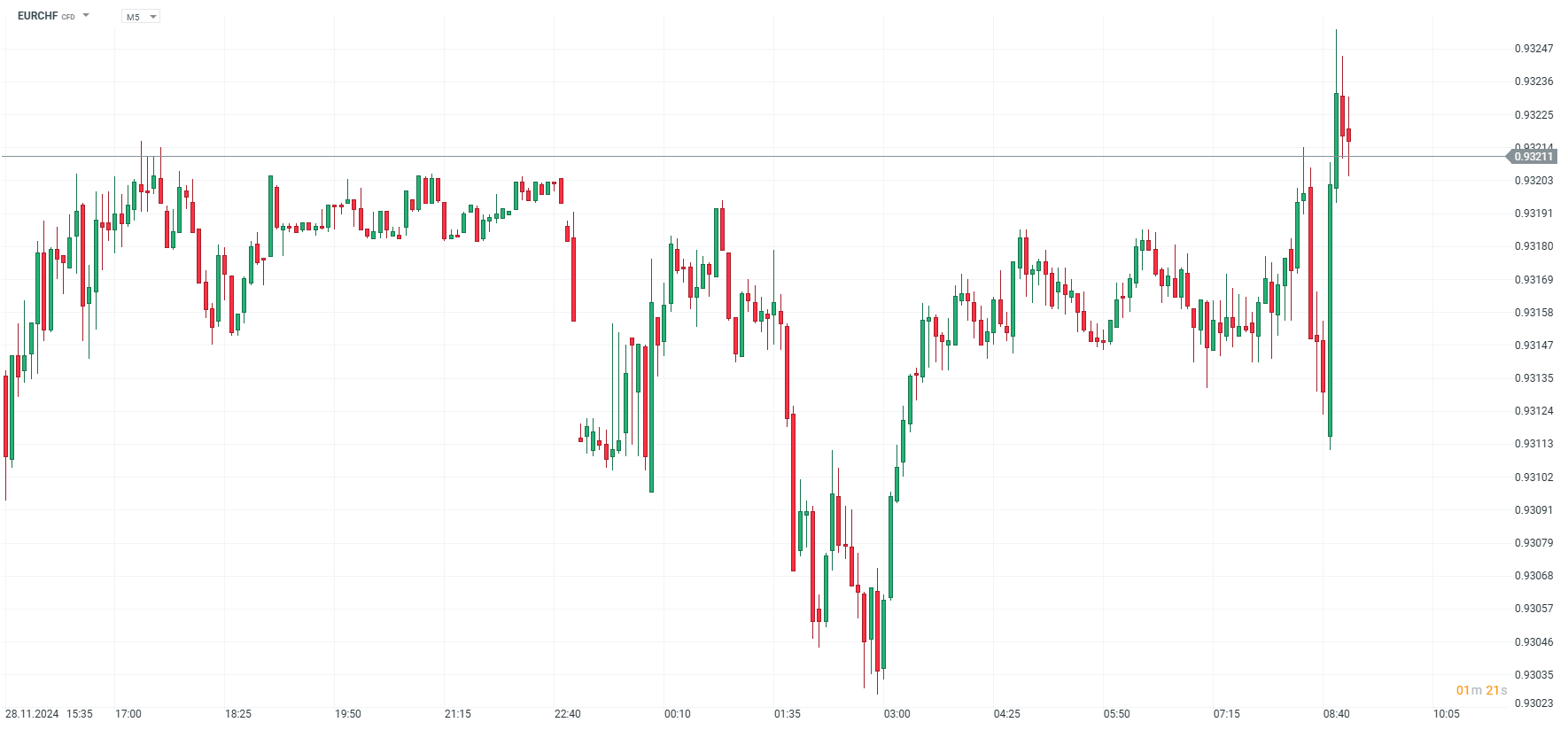 Perechea EURCHF a crescut astăzi cu doar 0,1%; perechea a reacționat cu o mișcare ușor ascendentă după un rezultat macro mai puternic decât se aștepta din Elveția și o inflație CPI mai mică decât se aștepta din Franța, cu o ratare neașteptată a cheltuielilor de consum din Franța.