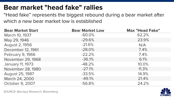 În plus, impulsul ascendent ar putea reprezenta doar o corecție în cadrul trendului negativ, cunoscută sub numele ”head fake”. Piețele de scădere care au început în 2000 și 2007 au prezentat această particularitate, având loc secvențe de creștere de peste 20% înainte de inversarea trendului. Mai mult, cel mai mare fenomen ”head fake” a avut loc în timpul pieței descendente care a început în 1937 când piața s-a apreciat cu peste 60% înainte de a suferi o nouă secvență de scădere.