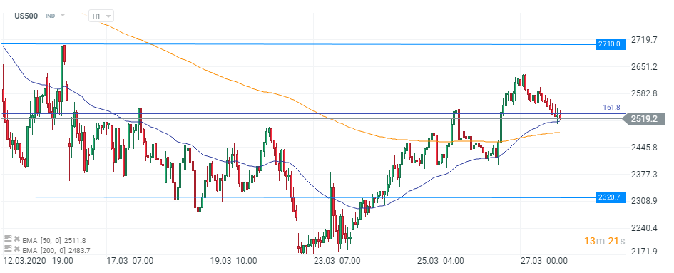Pe graficul H1, se observă o tendință de reîntoarcere către nivelul de interes de la aproximativ 2534 de puncte, care este susținut de o retragere exterioară Fibonacci de 161,8% din secvența corectivă din ultima săptămână a lunii februarie. Acesta pare să devină principalul suport pe termen scurt, fiind susținut și de o combinație a mediilor mobile exponențiale de 50 și 200 de perioade. Totuși, balanța pare a fi mai degrabă înclinată descendent în urma acestei secvențe ascendente. Doi factori majori de incertitudine rămân activi: orizontul de timp de carantină economică necesară pentru limitarea răspândirii virusului și impactul economic total.