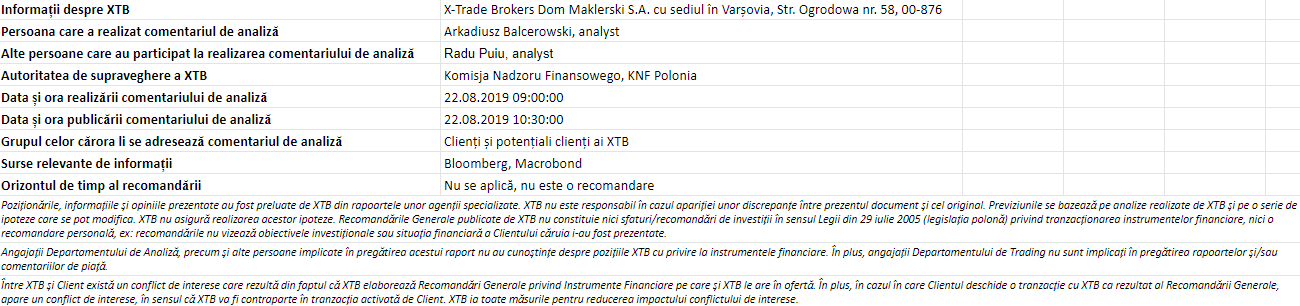 "Acest material este o comunicare de marketing în sensul articolului 24 alineatul (3) din Directiva 2014/65 / UE a Parlamentului European și a Consiliului din 15 mai 2014 privind piețele de instrumente financiare, și de modificare a Directivei 2002/92 / CE și a Directivei 2011 / 61 / UE (MiFID II). Comunicarea de marketing nu este o recomandare de investiții sau o recomandare de informații sau o recomandare care sugerează o strategie de investiții în sensul Regulamentului (UE) nr. 596/2014 al Parlamentului European și al Consiliului din 16 aprilie 2014 privind abuzul de piață ( reglementarea abuzului de piață) și de abrogare a Directivei 2003/6 / CE a Parlamentului European și a Consiliului și a Directivelor Comisiei 2003/124 / CE, 2003/125 / CE și 2004/72 / CE și a Regulamentului delegat (UE) 2016/958 al Comisiei din 9 596/2014 al Parlamentului European și al Consiliului în ceea ce privește standardele tehnice de reglementare pentru aranjamentele tehnice pentru prezentarea obiectivă a recomandărilor de investiții sau a altor informații care sugerează strategii de investiții și pentru dezvăluirea de interese particulare sau indicații de conflicte de interese sau orice alte sfaturi, inclusiv în domeniul consultanței în materie de investiții, în sensul Legii privind tranzacționarea cu instrumente financiare din 29 iulie 2005 (de ex. Journal of Laws 2019, articolul 875, astfel cum a fost modificat). Comunicarea de marketing este pregătită cu cea mai mare diligență, obiectivitate, prezintă faptele cunoscute autorului la data pregătirii și este lipsită de orice elemente de evaluare. Comunicarea de marketing este pregătită fără a lua în considerare nevoile clientului, situația sa financiară individuală și nu prezintă nicio strategie de investiții în niciun fel. Comunicarea de marketing nu constituie o ofertă de vânzare, oferire, abonament, invitație la cumpărare, reclamă sau promovare a oricărui instrument financiar. XTB SA nu este responsabilă pentru acțiunile sau omisiunile niciunui client, în special pentru achiziționarea sau cedarea instrumente, întreprinse pe baza informațiilor conținute în această comunicare de marketing. XTB SA nu va accepta răspunderea pentru nicio pierdere sau daună, inclusiv, fără limitare, orice pierdere care poate apărea direct sau indirect, efectuată pe baza informațiilor conținute în această comunicare de marketing. În cazul în care comunicarea de marketing conține informații despre orice rezultat cu privire la instrumentele financiare indicate în acestea, acestea nu constituie nicio garanție sau prognoză cu privire la rezultatele viitoare. Performanțele anterioare nu indică neapărat rezultatele viitoare și orice persoană care acționează pe baza acestor informații o face pe propriul risc. Acest material nu este emis pentru a influenta deciziile de tranzacționare ale niciunei persoane. Informațiile cuprinse în cadrul acestui material nu sunt prezentate pentru a fi aplicate, copiate sau testate în cadrul tranzacțiilor dumneavoastră. Informațiile cuprinse în cadrul acestui material sunt emise în baza experienței proprii a emitentului și nu reprezintă o recomandare individuală, nu vizează atingerea anumitor obiective, randamente financiare și nu se adresează nevoilor niciunei persoane anume care ar primi-o. Premisele acestui material nu au în vedere situația și persoana dumneavoastră deci nu recomandăm utilizarea acestor informații sub orice formă. Utilizarea informațiilor cuprinse în cadrul acestui material în orice modalitate se face pe propria dumneavoastră răspundere. Acest material este emis de către un analist pentru care își asumă răspunderea XTB SA, persoană juridică autorizată de KNF – Autoritatea de Supraveghere Financiara din Polonia."