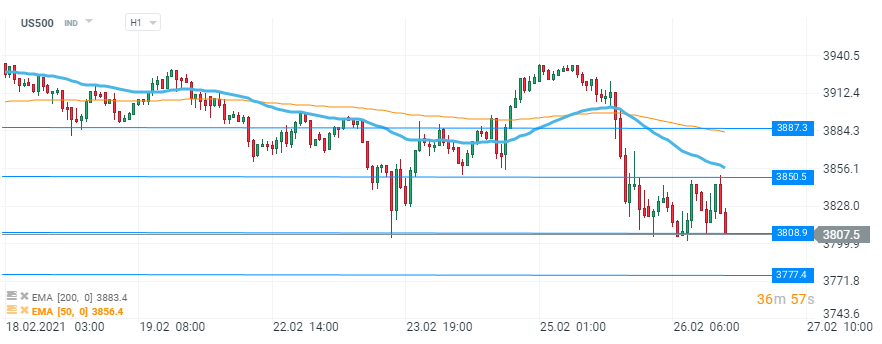 Analizând graficul US 500 observăm o perioadă de tranzacționare extrem de volatilă, indicele fiind lipsit de o direcție clară. În plus, observăm schimbări bruște de atitudine care se transpun în inversări ale prețului. Pentru moment, cotația pare să fie blocată în interiorul unui interval lateral: 3.809 puncte este limita inferioară și 3.850 de puncte este limita superioară. Orice spargere a unuia dintre cele două niveluri ar putea să dicteze direcția de evoluție pe termen scurt. În cazul unei spargeri în sus, nivelul 3.887 de puncte ar putea fi vizat, totuși trebuie să ținem cont de prezența celor două medii mobile, de 50 și 200 de perioade (linia albastră, respectiv linia portocalie) care ar putea ține sub control entuziasmul cumpărătorilor. În cazul unei spargeri descendente următorul nivel de urmărit este la 3.777 de puncte.