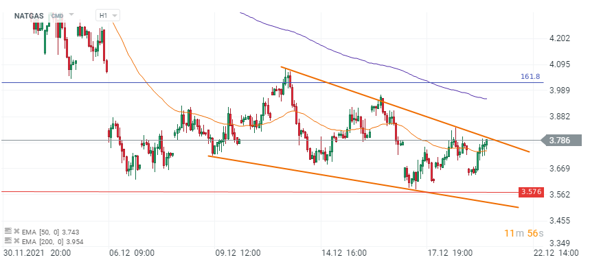 Această schimbare de context este observată și pe grafic, unde putem observa pe intervalul H1 prezența unui wedge descendent. Acesta sugerează o mișcare descendentă intensă din parte vânzătorilor care pun presiune asupra prețului. În momentul de față prețul se află într-un punct interesant, testând limita superioară a formațiunii. În cazul unei respingeri în jos, vânzătorii ar putea primi confirmarea necesară pentru a dezvolta o mișcare către nivelul de la 3,576 USD, un prag care a fost important și în trecut (perioada iunie - iulie). În caz contrar, o spargere în sus ar putea infirma formațiunea și să îi susțină pe cumpărători pentru a se îndrepta către media mobilă de 200 de perioade (linia mov) din zona 3,950 USD.