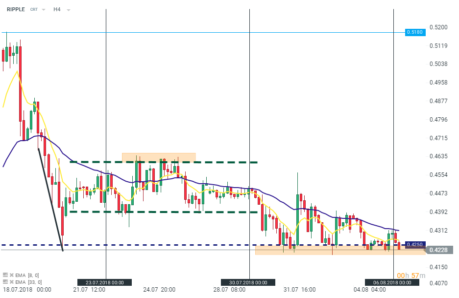 RIPPLE oscilează între zona de suport din jurul valorii de 0.425 dolari și media mobilă de 33 de perioade pe graficul H4 (linia mov), ce pare să limiteze o potențială apreciere. Săptămâna trecută, moneda a testat zona menționată, însă acțiunea de spargere nu a avut succes. Sursa: xStation5