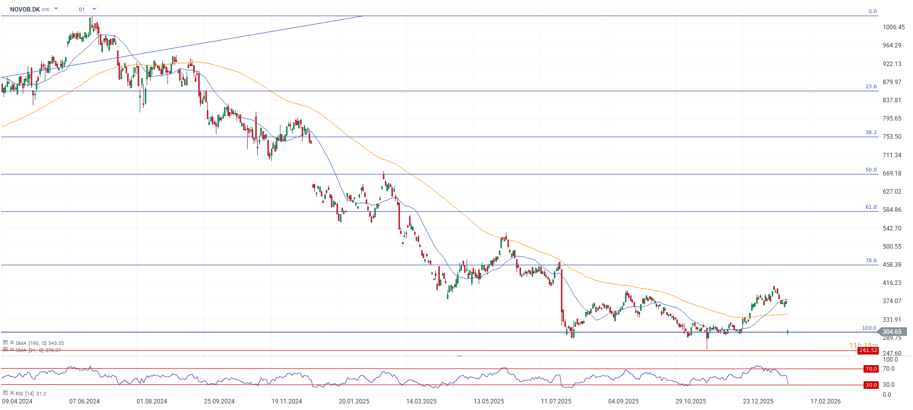 Acțiunile Novo Nordisk (NOVOB.DK) pierd în jur de 18% astăzi, după ce gigantul farmaceutic danez a publicat raportul privind veniturile pentru ultimul trimestru al anului fiscal 2025, investitorii reacționând negativ la perspectivele mai slabe decât se aștepta pentru anul următor.