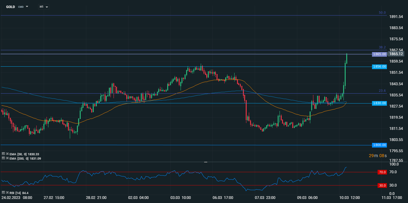 Dintr-o perspectivă tehnică, aurul inversează temporar tendința descendentă pe termen scurt care a fost în vigoare de la începutul lunii februarie. Totuși, pentru a discuta despre o potențială reluare a trendului ascendent va necesita o spargere clară deasupra zonei 1.856 - 1.858 USD, unde se află minimul de pe 6 martie. În prezent, cotația testează nivelul de rezistență de la 1.865 USD.