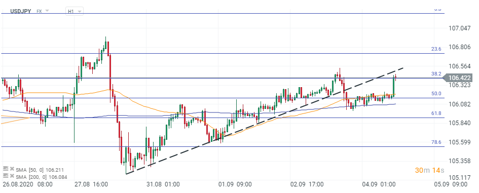 Din punct de vedere tehnic, perechea USDJPY se află într-un punct cheie pentru direcția de evoluție a cotației pe termen scurt. Datele NFP au fost considerate pozitive, având un efect benefic pe termen scurt și alimentând secvența bună a dolarului american. În acest context, prețul a revenit în apropierea zonei de rezistență 106,400 - 106,500 care a fost testată și ieri, fără însă a avea succes. În eventualitatea unei spargeri, cumpărătorii de USD ar putea încerca să readucă prețul deasupra liniei ascendente de trend, fapt care ar putea oferi un impuls cotației, cel puțin pe termen scurt. În eventualitatea unei respingeri, primul nivel de urmărit este la 106,170, care este marcat și de o retragere fibonacci de 50% din secvența corectivă de la sfârșitul lunii iulie. Totuși, nu putem exclude o nouă perioadă de slăbiciune a dolarului. Conform unui sondaj realizat de Reuters, tendința descendentă a dolarului ar putea continua pentru cel puțin încă trei luni din cauza perspectivelor politicii monetare a Fed.