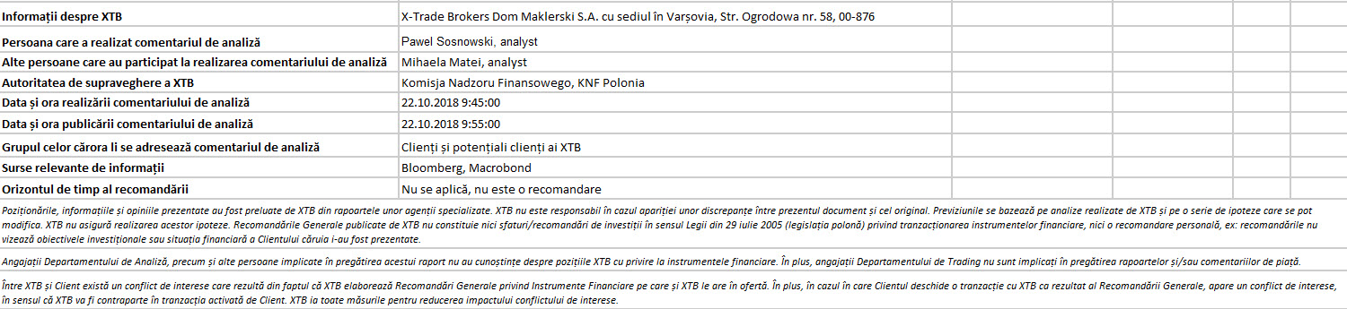 "Acest material este o comunicare de marketing în sensul articolului 24 alineatul (3) din Directiva 2014/65 / UE a Parlamentului European și a Consiliului din 15 mai 2014 privind piețele de instrumente financiare, și de modificare a Directivei 2002/92 / CE și a Directivei 2011 / 61 / UE (MiFID II). Comunicarea de marketing nu este o recomandare de investiții sau o recomandare de informații sau o recomandare care sugerează o strategie de investiții în sensul Regulamentului (UE) nr. 596/2014 al Parlamentului European și al Consiliului din 16 aprilie 2014 privind abuzul de piață ( reglementarea abuzului de piață) și de abrogare a Directivei 2003/6 / CE a Parlamentului European și a Consiliului și a Directivelor Comisiei 2003/124 / CE, 2003/125 / CE și 2004/72 / CE și a Regulamentului delegat (UE) 2016/958 al Comisiei din 9 596/2014 al Parlamentului European și al Consiliului în ceea ce privește standardele tehnice de reglementare pentru aranjamentele tehnice pentru prezentarea obiectivă a recomandărilor de investiții sau a altor informații care sugerează strategii de investiții și pentru dezvăluirea de interese particulare sau indicații de conflicte de interese sau orice alte sfaturi, inclusiv în domeniul consultanței în materie de investiții, în sensul Legii privind tranzacționarea cu instrumente financiare din 29 iulie 2005 (de ex. Journal of Laws 2019, articolul 875, astfel cum a fost modificat). Comunicarea de marketing este pregătită cu cea mai mare diligență, obiectivitate, prezintă faptele cunoscute autorului la data pregătirii și este lipsită de orice elemente de evaluare. Comunicarea de marketing este pregătită fără a lua în considerare nevoile clientului, situația sa financiară individuală și nu prezintă nicio strategie de investiții în niciun fel. Comunicarea de marketing nu constituie o ofertă de vânzare, oferire, abonament, invitație la cumpărare, reclamă sau promovare a oricărui instrument financiar. XTB SA nu este responsabilă pentru acțiunile sau omisiunile niciunui client, în special pentru achiziționarea sau cedarea instrumente, întreprinse pe baza informațiilor conținute în această comunicare de marketing. XTB SA nu va accepta răspunderea pentru nicio pierdere sau daună, inclusiv, fără limitare, orice pierdere care poate apărea direct sau indirect, efectuată pe baza informațiilor conținute în această comunicare de marketing. În cazul în care comunicarea de marketing conține informații despre orice rezultat cu privire la instrumentele financiare indicate în acestea, acestea nu constituie nicio garanție sau prognoză cu privire la rezultatele viitoare. Performanțele anterioare nu indică neapărat rezultatele viitoare și orice persoană care acționează pe baza acestor informații o face pe propriul risc. Acest material nu este emis pentru a influenta deciziile de tranzacționare ale niciunei persoane. Informațiile cuprinse în cadrul acestui material nu sunt prezentate pentru a fi aplicate, copiate sau testate în cadrul tranzacțiilor dumneavoastră. Informațiile cuprinse în cadrul acestui material sunt emise în baza experienței proprii a emitentului și nu reprezintă o recomandare individuală, nu vizează atingerea anumitor obiective, randamente financiare și nu se adresează nevoilor niciunei persoane anume care ar primi-o. Premisele acestui material nu au în vedere situația și persoana dumneavoastră deci nu recomandăm utilizarea acestor informații sub orice formă. Utilizarea informațiilor cuprinse în cadrul acestui material în orice modalitate se face pe propria dumneavoastră răspundere. Acest material este emis de către un analist pentru care își asumă răspunderea XTB SA, persoană juridică autorizată de KNF – Autoritatea de Supraveghere Financiara din Polonia."