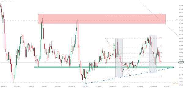 Prețul porumbului se află în apropierea unei importante zone de suport (347). Sursa: xStation5