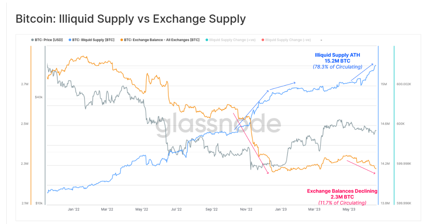 Oferta nelichidă Bitcoin a crescut din noiembrie 2022, indicând un rol tot mai mare al investitorilor pe termen lung. Rata de schimbare arată o medie de 146 mii BTC trimiși către portofolii nelichide/lună. Aprovizionarea nelichidă a atins un nou ATH - 15,2 milioane BTC. În acel moment când soldurile burselor crypto au scăzut la cele mai scăzute niveluri din 2018. Pe termen lung, fenomenul ar trebui să susțină tendința ascendentă. Ea ilustrează incertitudinea din jurul entităților de pe criptomonede - dar nu și Bitcoin în sine. Sursa: Glassnode