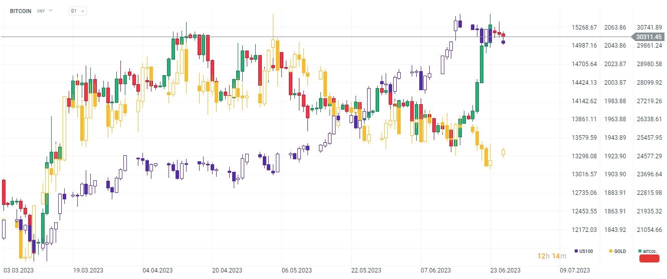 Criptomonedele înregistrează o ușoară corecție după câștigurile euforice ale Bitcoin de săptămâna trecută. În același timp, BTC se tranzacționează peste 30.000 USD pentru prima dată de la mijlocul lunii aprilie. A surprins investitorii cu întreruperea corelației sale cu indicele Nasdaq și prețurile aurului, totuși, pare în mod clar favorizat de dolarul american mai slab. După cererile de creare de ETF-uri de la BlackRock, Fidelity, Invesco și WisdomTree, speculațiile privind interesul investitorilor instituționali și achiziționarea de BTC de către așa-numitele „balene” sunt în creștere. Când adâncimea pieței este scăzută, chiar și o mică creștere a ordinelor de cumpărare poate afecta semnificativ volatilitatea prețurilor.