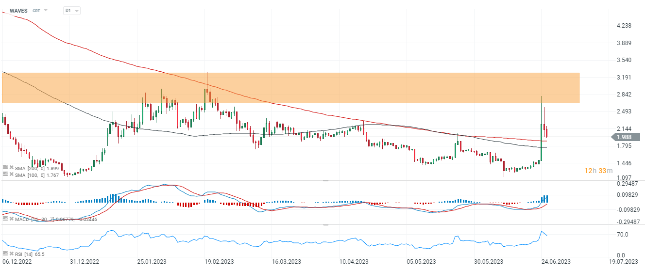 WAVES, interval zilnic. Prețul a crescut cu aproape 100% în ultimele zile și a început o corecție. Cheia pentru tauri va fi revenirea în zona de 2,7 dolari - ar putea anunța o spargere a maximelor din februarie, anul acesta la 3,2 dolari. Se pare că suportul cheie s-ar putea dovedi a fi media mobilă de 200 de perioade(linia roșie) - la 1,9 USD. Prețul a depășit media mobilă cheie pentru a continua tendința pentru prima dată în aproape doi ani. Sursa: xStation5