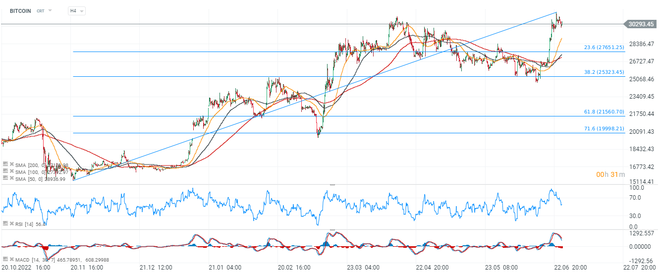 BITCOIN, interval zilnic. Analizând graficul, putem observa că suportul principal în cazul unei corecții este nivelul de 27.700 USD unde se află retragerea Fibonacci de 23,6 a valului ascendent din toamna lui 2022. Cu toate acestea, cheia impulsului în sine poate fi media mobilă de 50 de perioade(linia galbenă). Anterior - în timpul creșterilor, prețul nu a încălcat această limită și depășirea ei a anunțat perioade de slăbiciune. În prezent, media mobilă se află la aproximativ 29.000 USD - aceasta este limita de impuls. Dacă Bitcoin reușește să păstreze acest suport - scenariul de bază este o creștere în continuare. Sursa: xStation5