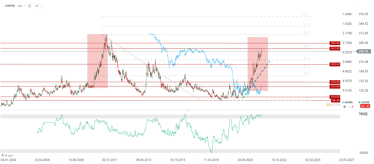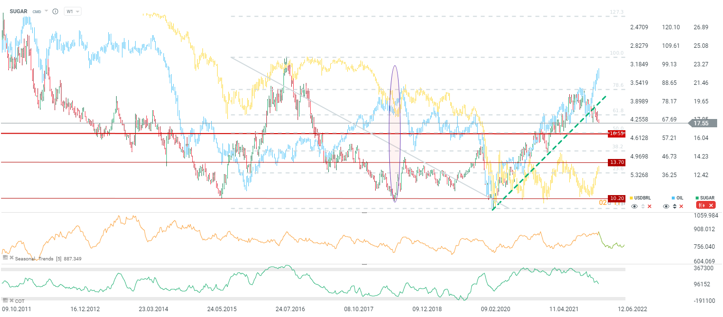 Se poate observa o divergență semnificativă între prețul zahărului și prețul petrolului. În cazul în care prețurile carburanților în Brazilia sunt majorate, investitorii s-ar putea orienta către piața zahărului. În plus, consolidarea BRL poate limita exporturile. Poziționarea curentă speculativă short ar putea fi tratată ca un semnal contrariant. Sursa: xStation5