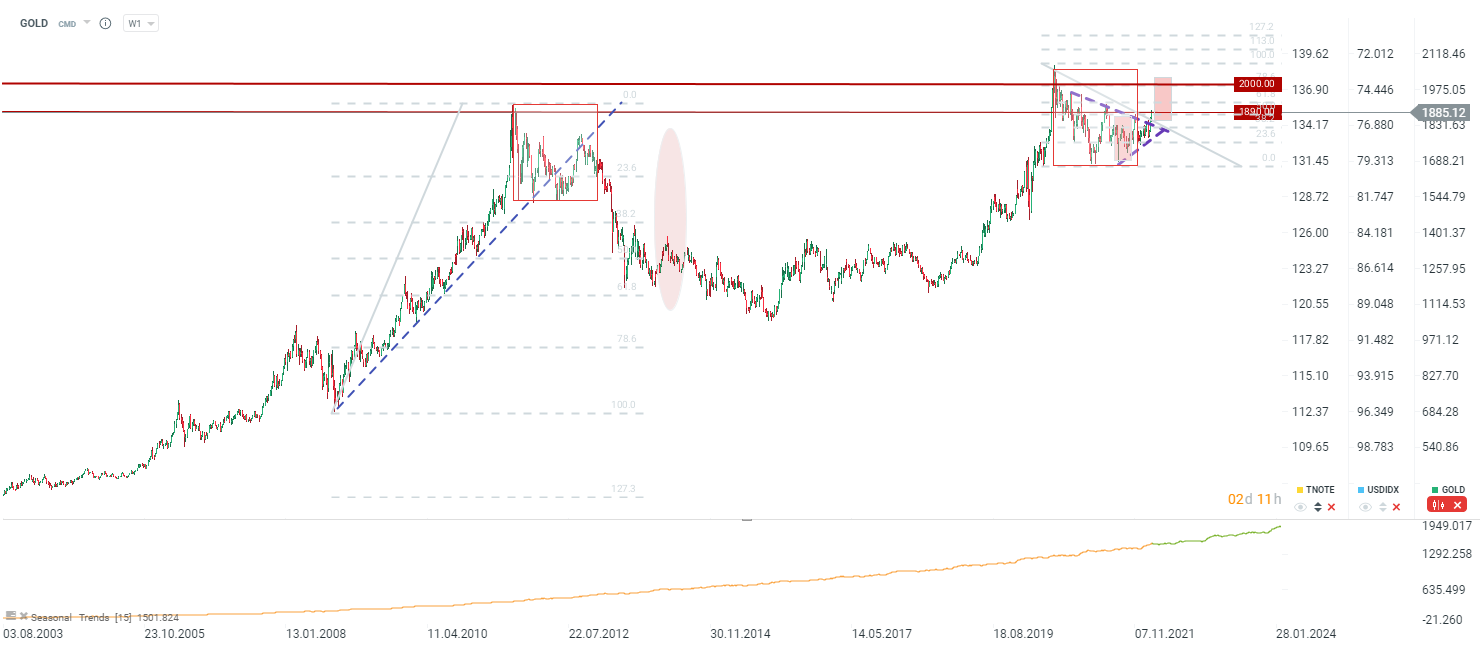 Prețul aurului a spart deasupra liniei descendente de trend care a acționat ca o limită superioară a unui model de triunghi. Sursa: xStation5