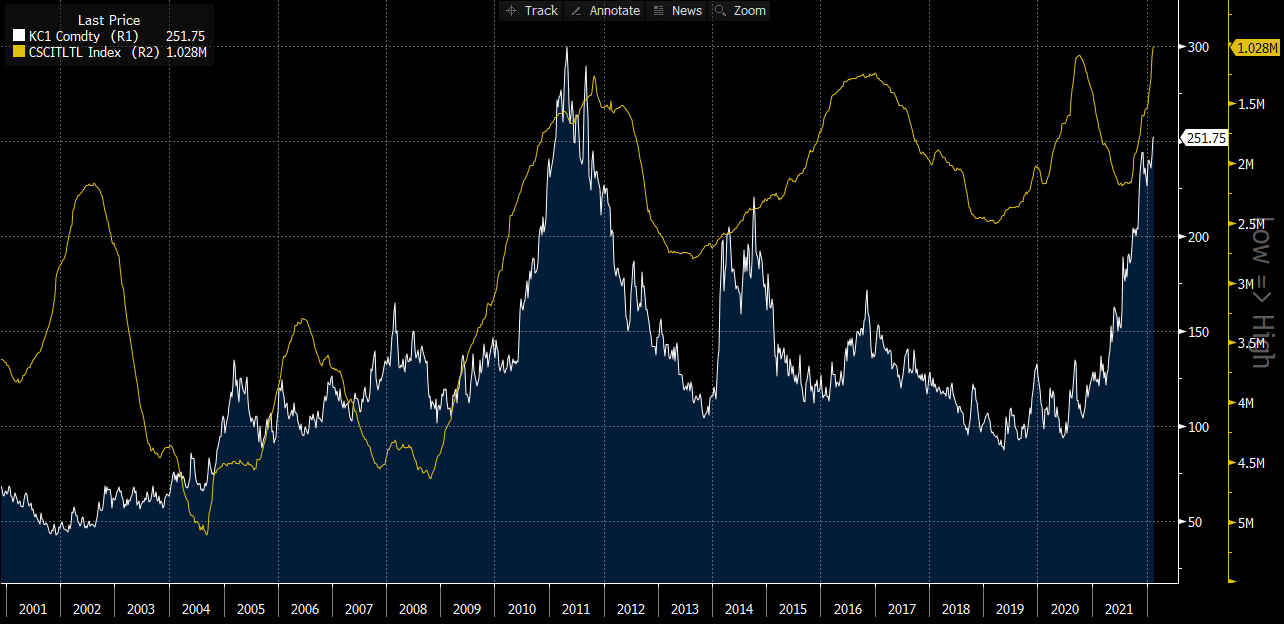 Stocurile de cafea continuă să scadă. O scădere a stocurilor sub 1 milion de pungi ar putea fi un eveniment important pentru piețele globale de cafea. Trebuie remarcat faptul că 1 milion de pungi de cafea reprezintă mai puțin de 1% din consumul global de cafea. Sursa: Bloomberg