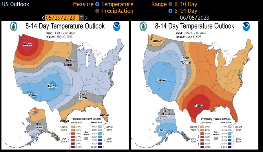 Vremea în Statele Unite se va îmbunătăți în următoarele 8-14 zile, temperaturile estimate să fie peste medie pentru această perioadă a anului. Sursa: Bloomberg