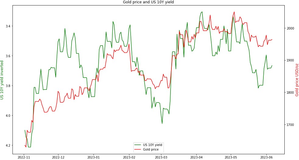 Aruncând o privire la scăderea recentă a randamentelor (axa inversată), situația începe să semene cu cea din martie, când prețurile au crescut la maxime record. Dacă prețul reacționează în mod similar acum, aurul ar putea crește până la zona de 2.160 USD