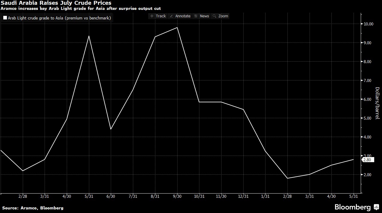 Prețurile de export din Arabia Saudită cresc după ce au atins un minim local în februarie. Cu toate acestea, prima este relativ mică, ceea ce sugerează că cererea de petrol saudit este limitată. Este, de asemenea, legat de petrolul ieftin competitiv din Rusia. Sursa: Bloomberg