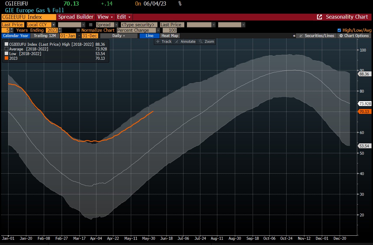 Stocurile europene de gaze sunt refăcute. În prezent, stocurile sunt pline aproximativ 70% de la aproximativ 40% în această perioadă a anului în 2021. Sursa: Bloomberg