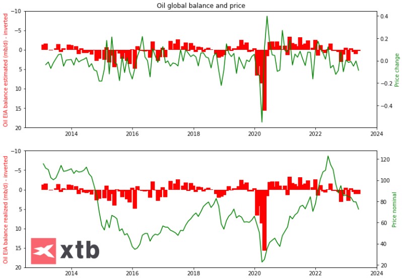 Surplusul global de oferte pe piața petrolului se ridică la aproximativ 1 milion de barili pe zi în prezent. Dacă cererea și oferta rămân neschimbate, piața s-ar putea echilibra după o reducere de 1 milion de barili din Arabia Saudită. Acest lucru ar trebui să susțină prețurile la niveluri actuale sau mai ridicate. Sursa: Bloomberg, XTB