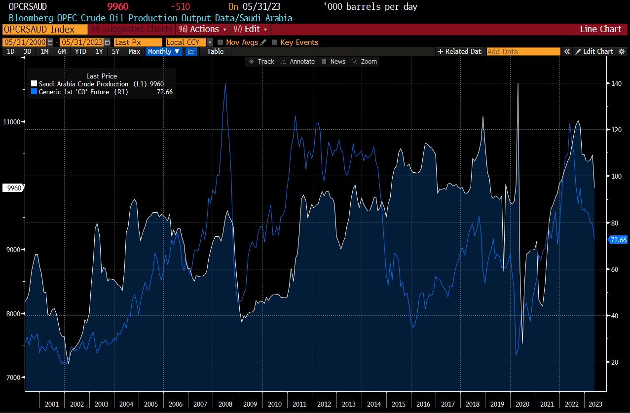 Arabia Saudită va reduce producția la aproximativ 9 milioane de barili pe zi. Acesta ar fi cel mai scăzut nivel de producție din ultimii 2 ani. Aruncând o privire istoric, prețurile au avut tendința de a crește atunci când Arabia Saudită a redus producția la 8,8 sau 8,0 milioane de barili. Sursa: Bloomberg