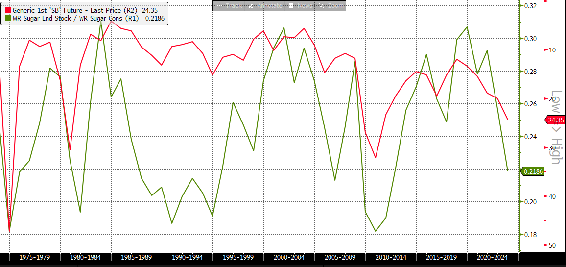 Stocurile finale globale de utilizat au scăzut semnificativ, ceea ce sugerează că prețurile ar putea urca către maximele din ultimele decenii. Sursa: Bloomberg