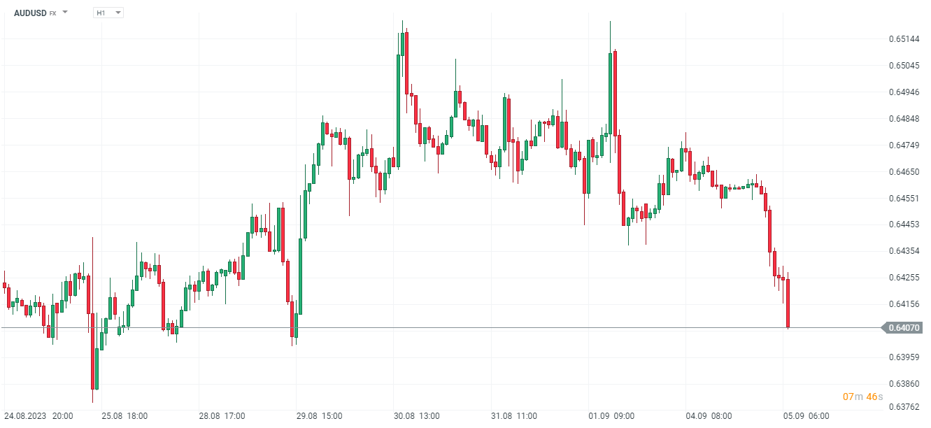 AUDUSD șterge aproape în întregime creșterile, care au fost susținute indirect de un optimism sporit cu privire la viitorul și sănătatea economiei chineze. China este unul dintre principalii parteneri comerciali ai Australiei și un consumator puternic de materii prime. Este acesta un semnal de avertizare pentru China? Sursa: xStation 5
