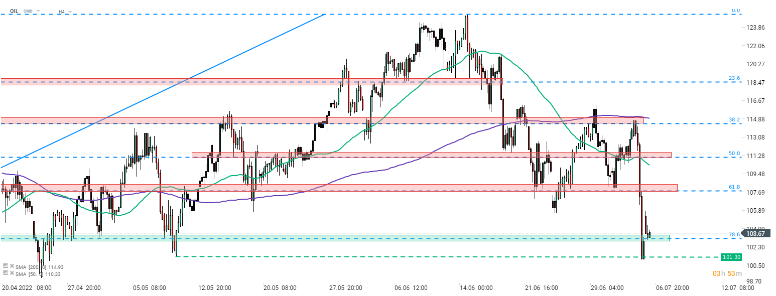 Brent (OIL) a retestat minimele din 11 mai 2022 în zona de 101,30 USD în timpul scăderii de ieri. Vânzarea a fost oprită deocamdată, prețul reușind să recupereze peste zona de suport marcată cu retragerea Fibonacci de 78,6% a mișcării ascendente începute în martie. Sursa: xStation5