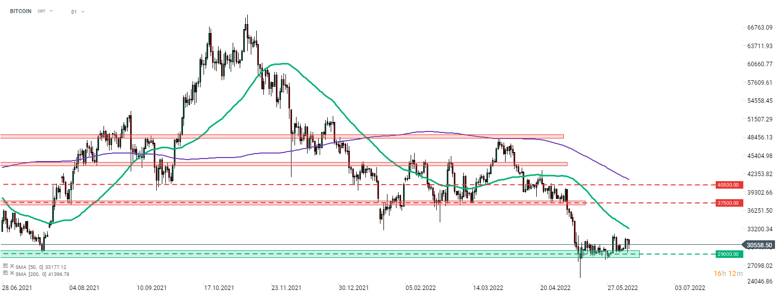 Bitcoin a șters aproape complet pierderile de ieri până la sfârșitul zilei. Cu toate acestea, vânzarea s-a reluat astăzi în timpul sesiunii din Asia. Moneda se tranzacționează cu peste 2% în scădere, dar reușește să se mențină peste pragul de 30.000 USD. Sursa: xStation5