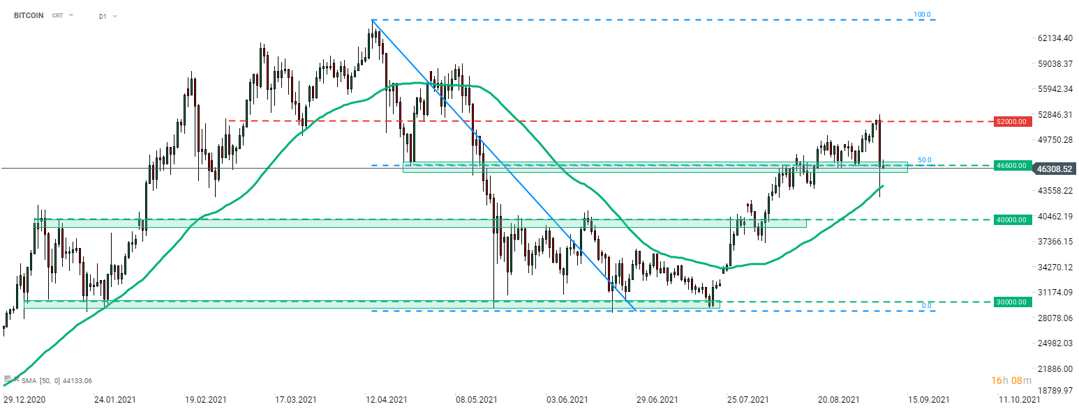 Bitcoin a scăzut masiv ieri și a atins cel mai scăzut nivel de la începutul lunii august. Cu toate acestea, declinul a fost oprit, iar moneda a reușit să revină la retragerea Fibonacci de 50% a corecției din aprilie-mai (zona de 46.600 de dolari). Sursa: xStation5