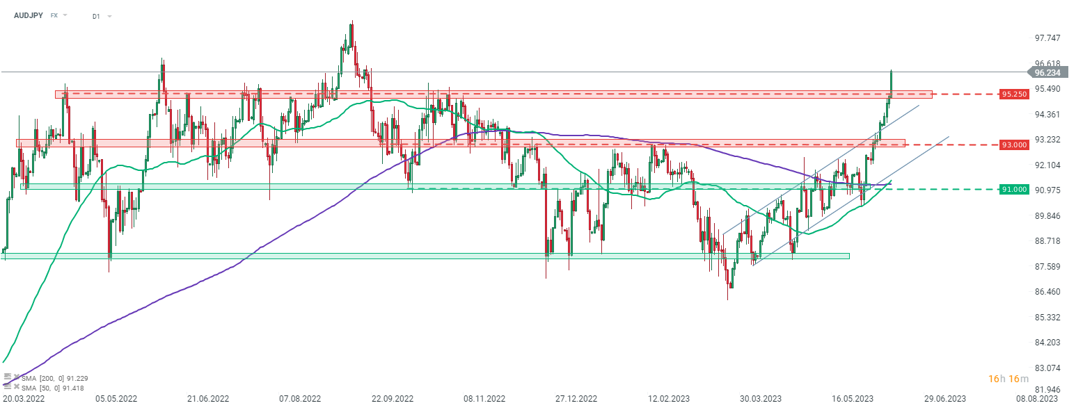 AUDJPY crește astăzi pe baza datelor solide privind locurile de muncă din Australia și a datelor comerciale mixte din Japonia. Perechea a depășit zona de rezistență 95,25 și se tranzacționează la niveluri nemaivăzute de la sfârșitul lunii septembrie 2022. Sursa: xStation5