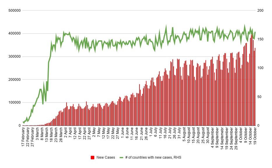 Aproape 340 de mii de cazuri noi de coronavirus au fost raportate ieri. Sursa: worldometers, XTB