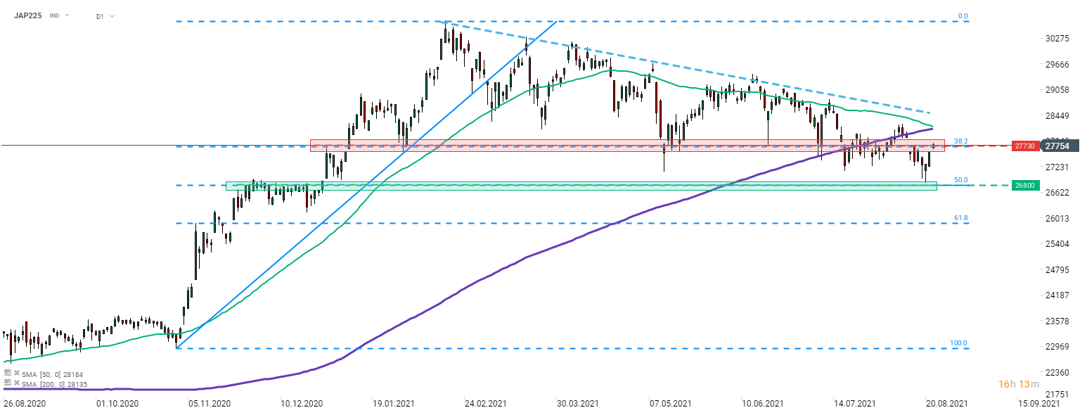 După o reacție pozitivă la zona de suport de 26.800 de puncte, Nikkei (JAP225) a lansat o mișcare de recuperare. Indicele testează în prezent zona de rezistență situată la nivelul de 27.730 puncte, zonă marcată cu retragerea Fibonacci de 38,2% a mișcării ascendente lansate în noiembrie 2021. Sursa: xStation5