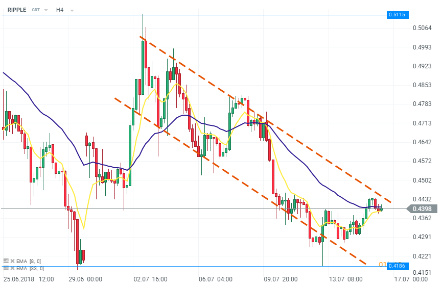 RIPPLE, la fel ca Litecoin, se apropie de limita superioară a canalului descendent. Moneda virtuală se situează imediat sub nivelul de 0,44 dolari la momentul scrierii articolului. Sursa: xStation5